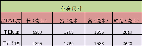 尺寸上,丰田C-HR的长宽高为4360/1795/1555毫米,轴距为2640毫米。而日产劲客的长宽高为4295/1760/1588毫米,轴距为2620毫米,在尺寸上丰田C-HR更适合中国消费者的大空间需求。